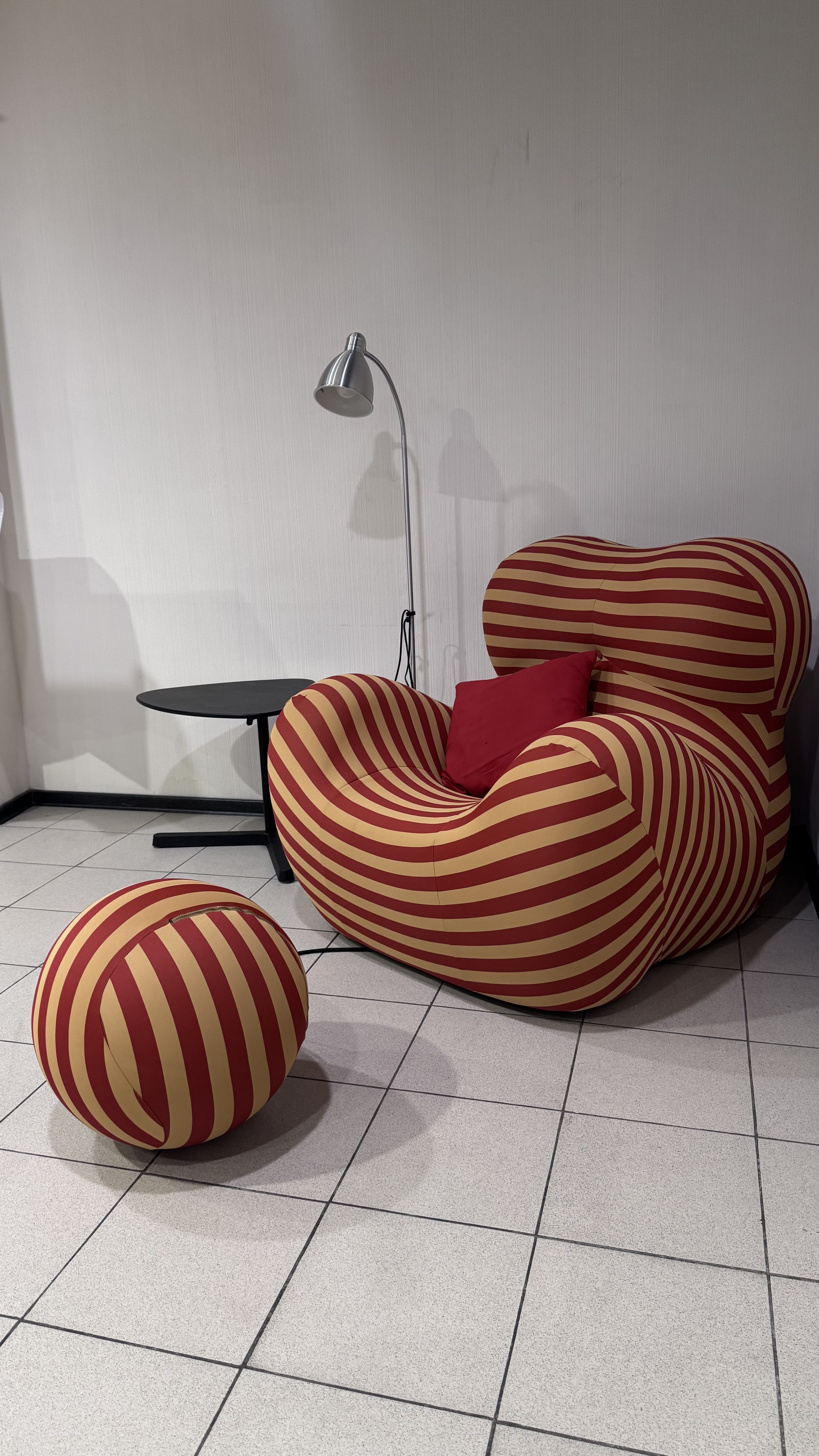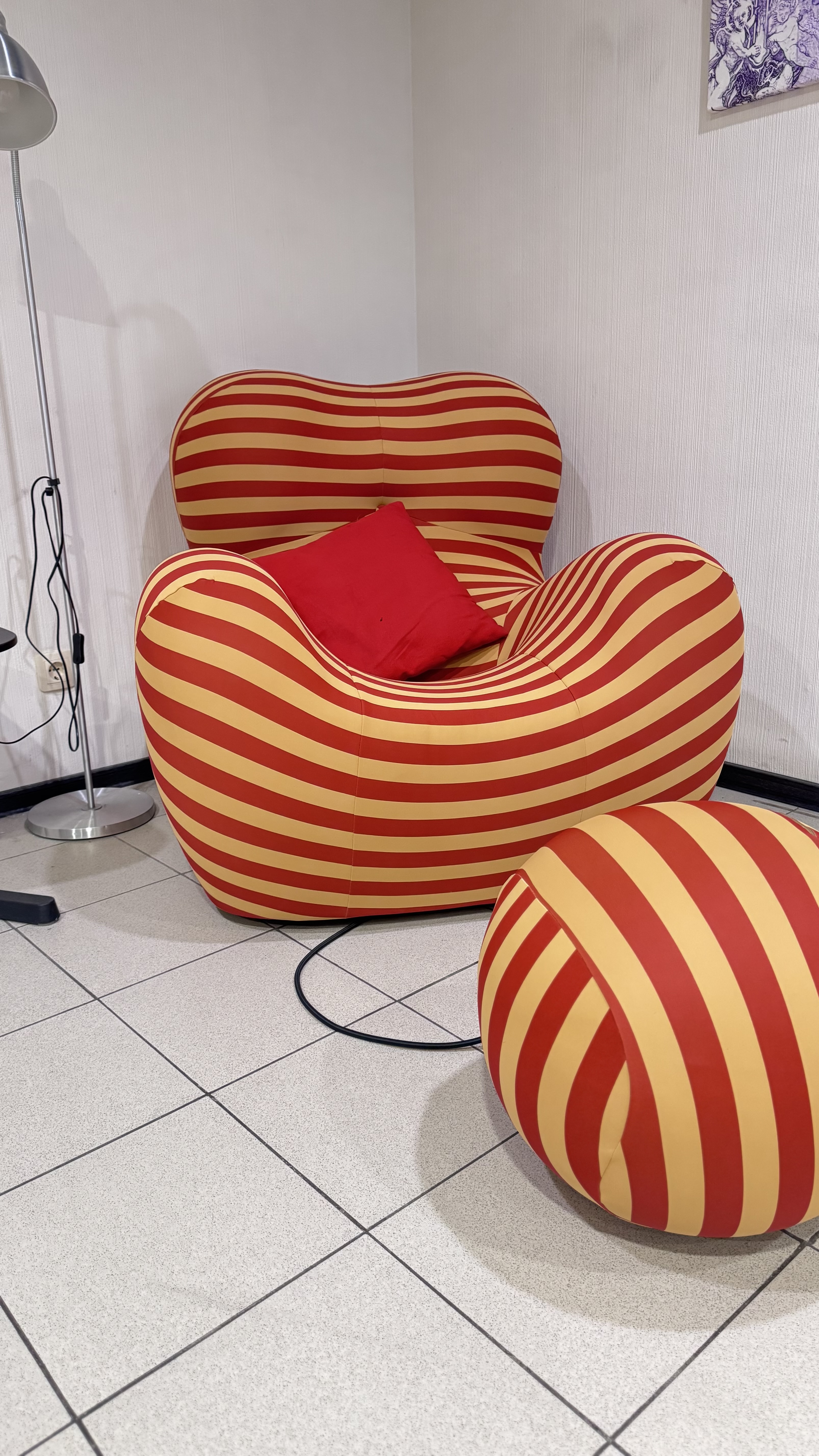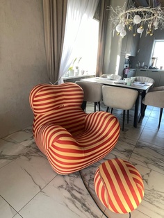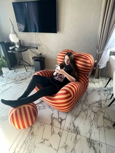 Кресло красивое, великолепный дизайн, само кресло довольно плотное и упругое, чехол из эластичной ткани, не очень плотной, пошит хорошо и аккуратно. На моем экземпляре - дефект шнура у основания мяча, вроде и на функционал не влияет, но как-то неприятно. Такую вещь покупаешь ради удовольствия, как-то не ждешь торчащих нитей.